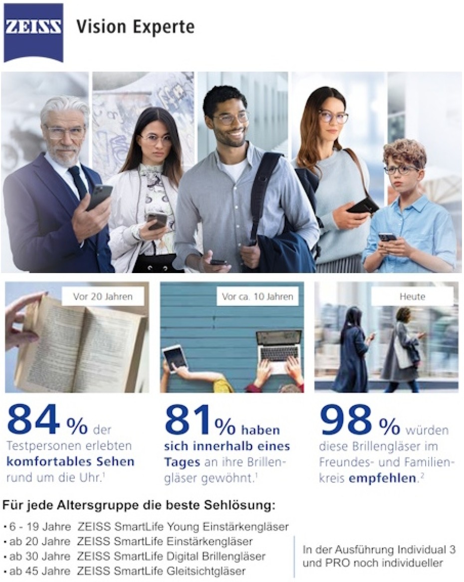 Das vernetzte Leben von heute ist für unsere Augen eine große Herausforderung. Dabei spielt das Smartphone eine wichtige Rolle. Der Blick wechselt immer wieder vom Display in die Ferne, zur Seite, nach unten, nach vorne. Welche Brillengläser können da mithalten? Die neuesten maßgefertigten Brillengläser von ZEISS – entwickelt speziell für die Sehanforderungen von heute und genau auf das Alter abgestimmt.